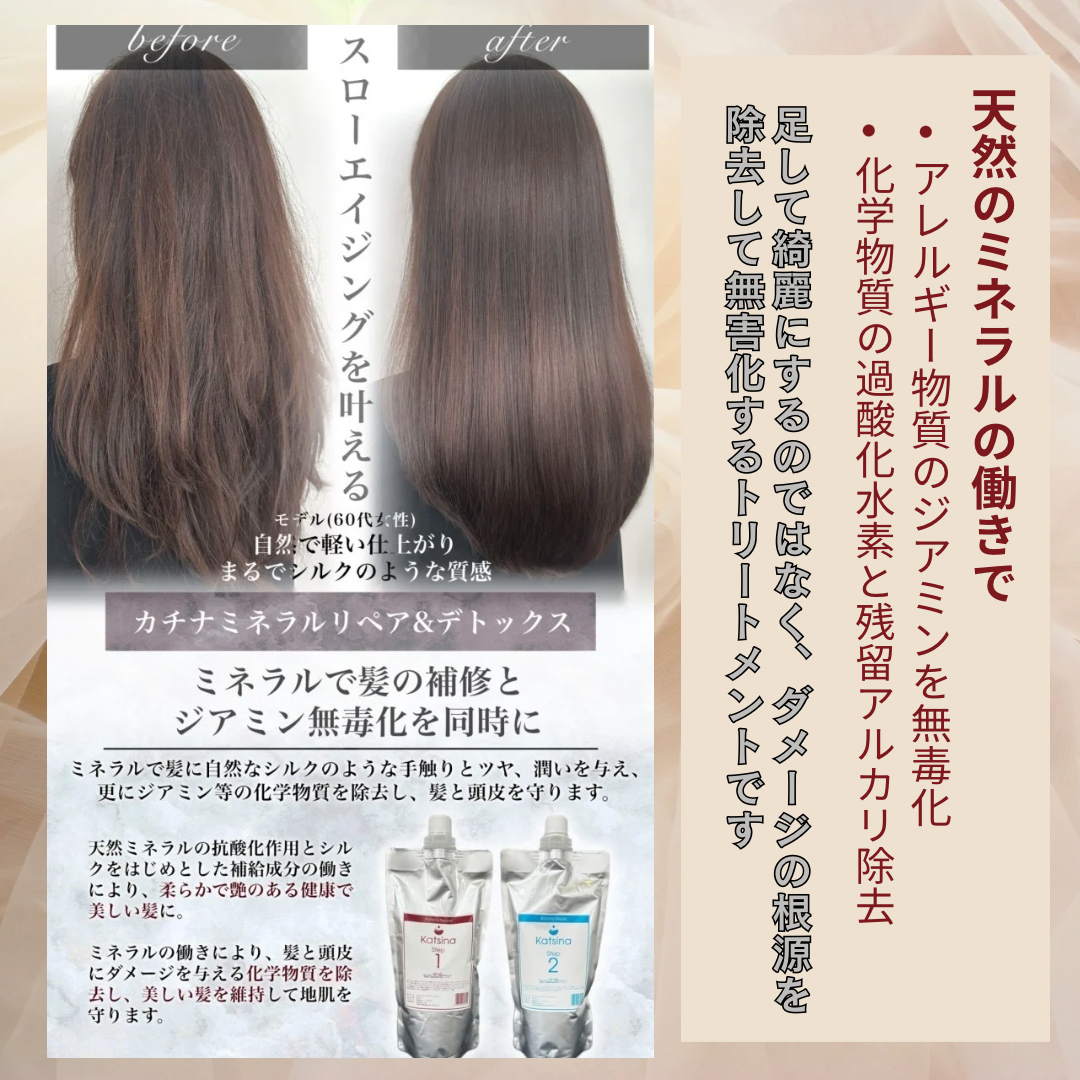 天然のミネラルの働きで、カラー剤に含まれるアルカリ・過酸化水素・ジアミンを無毒化。