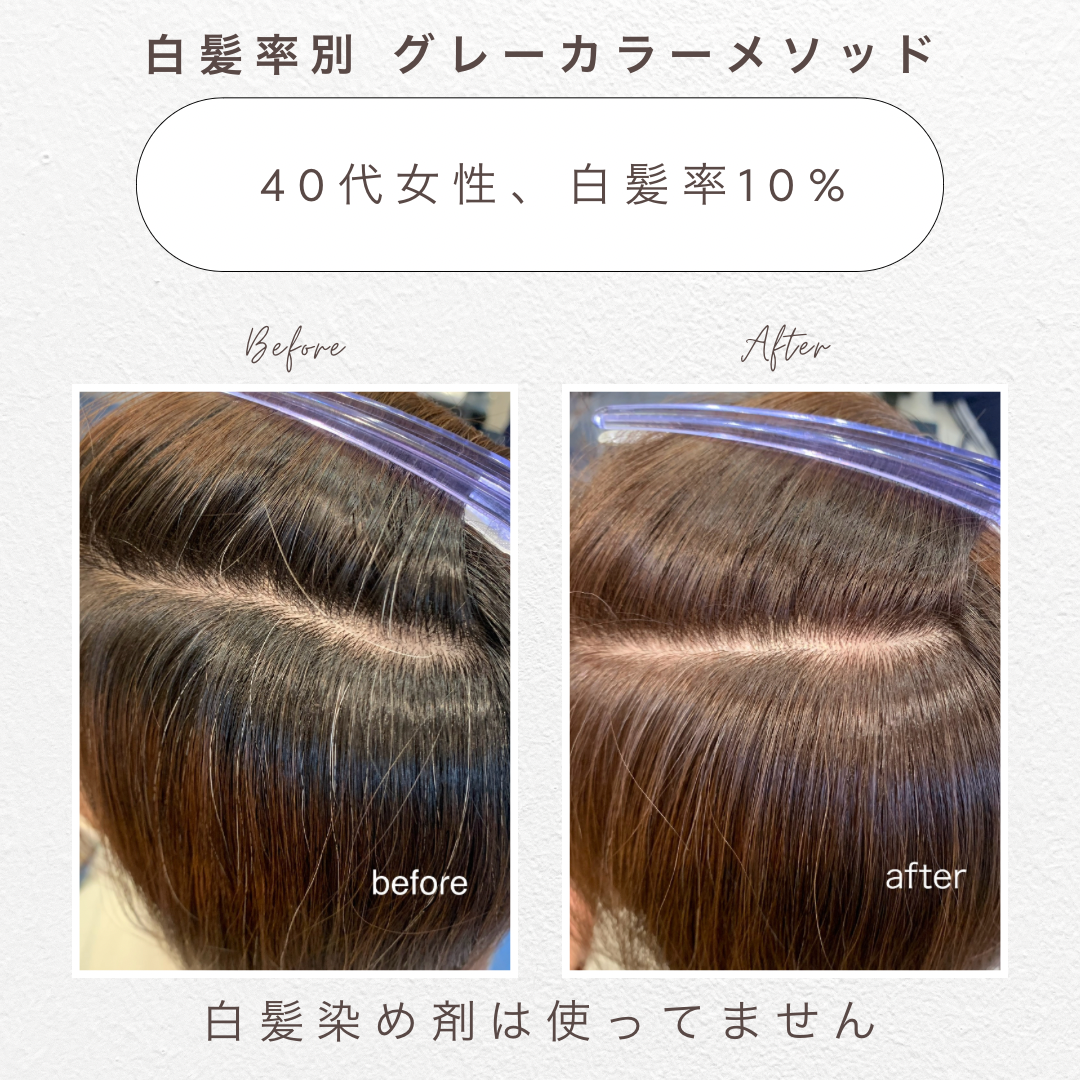 当店では、白髪染め剤を使わない、ファッションカラー剤で白髪を染める方法グレーカラーメソッドで、髪に透明感を表現し、髪にのせる薬剤そのものを優しいものにしています(低アルカリカラー剤)