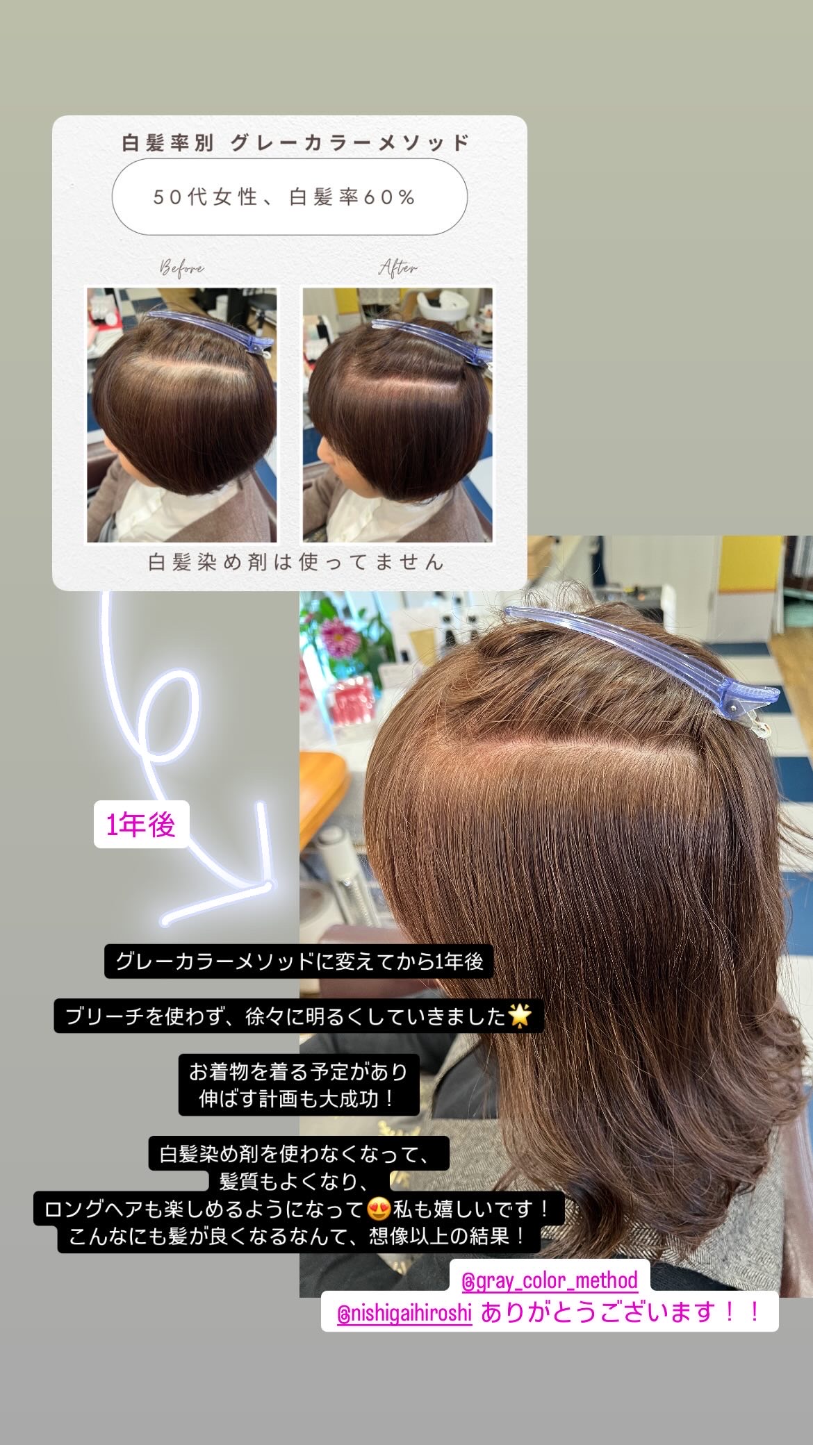 ブリーチ施術無しで、グレーカラーメソッドで根本の明るさを徐々に明るく調整することにより明るいヘアカラーもできるようになりました。